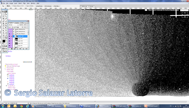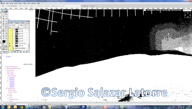 Aun asi, intentemos aplicar este concepto a estas dos fotografias. Es decir, imaginando que las rocas que la fotografia de Google Earth Moon (GEM) son la misma roca que se ha duplicado en la confeccion de la panoramica... ¿De cual de las tres lo ha hecho? Ninguna de las cinco rocas que aparecen tanto en GEM como en NASA son iguales. Todas presentan datos diferentes o diferentes orientaciones, mas, aun asi, quisimos ir mas lejos en nuestras conclusiones. Si la Geologa Planetaria de la NASA tuviera razon, si yo superpusiera varios elementos iguales de las dos fotografias deberia de obtener elementos coincidentes en aquel que estamos tomando como punto de apoyo y un fondo simplemente desplazado para el resto de la fotografia.